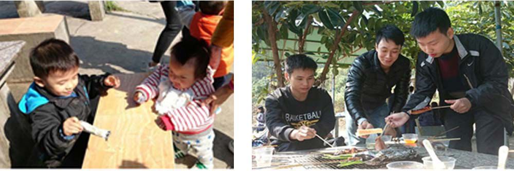 相對那些很久沒騎過自行車的同事來說,10公里還是有點困難的,況且一路上很多的坡斜、彎道,不過眼前有如此美景的吸引,大家都選擇完成全程。此時已是十一點多鐘了,體力也消耗的差不多,肚子也咕咕地叫起來,正好備有第二個活動:燒烤。一到燒烤場便是香氣撲鼻,看著別人哼著小曲,燒著雞翅,喝著小酒,劃著小拳,我們的心情早已按奈不住了,來到提前預定好的烤場前,看到很多好吃的東西:有肉丸、牛排、肉排、雞翅、雞腿、茄子、香橙、飲料等等。大家都紛紛拿著水果,飲料先充充饑,接著各自拿著一根細細的鐵絲,串上肉類蔬菜,放在烤爐上,抖撒各種調料,漸漸的香味四溢,烤得好的,大家搶著要吃,淋漓滿目燒肉串,那場景是相當的壯觀,不禁讓我們想起周星馳電影《唐伯虎點秋香》中的一句經典臺詞:“紅燒翅膀,我喜歡吃!”。現場到處都是香味四溢,歡聲笑語。